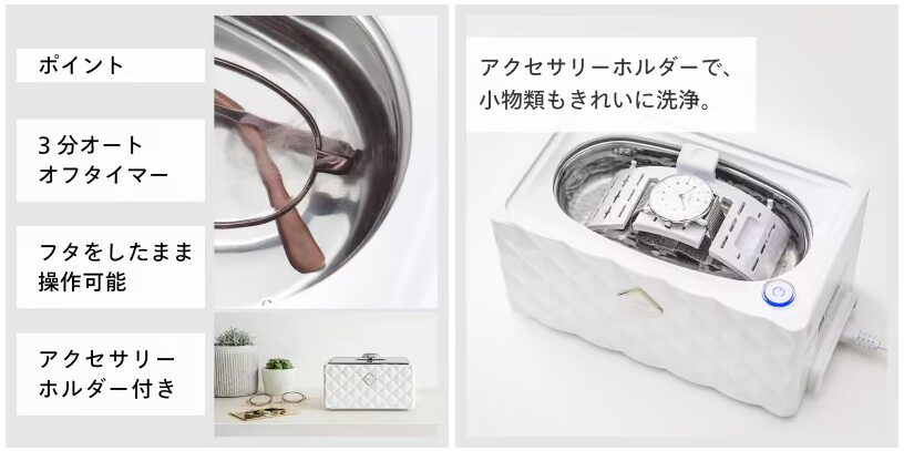 - 超音波の力:細かなスキマや隠れた汚れもすっきり洗浄。