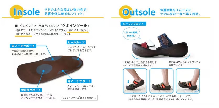 - ローリング歩行:丸みのあるソール形状で自然な体重移動と快適な歩行を実現。