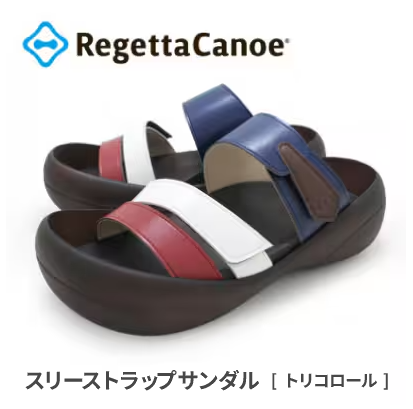 リゲッタカヌー トリコロールスリーストラップサンダルは、街歩き・旅行・立ち仕事にも快適な大阪製ブランド認証モデル。